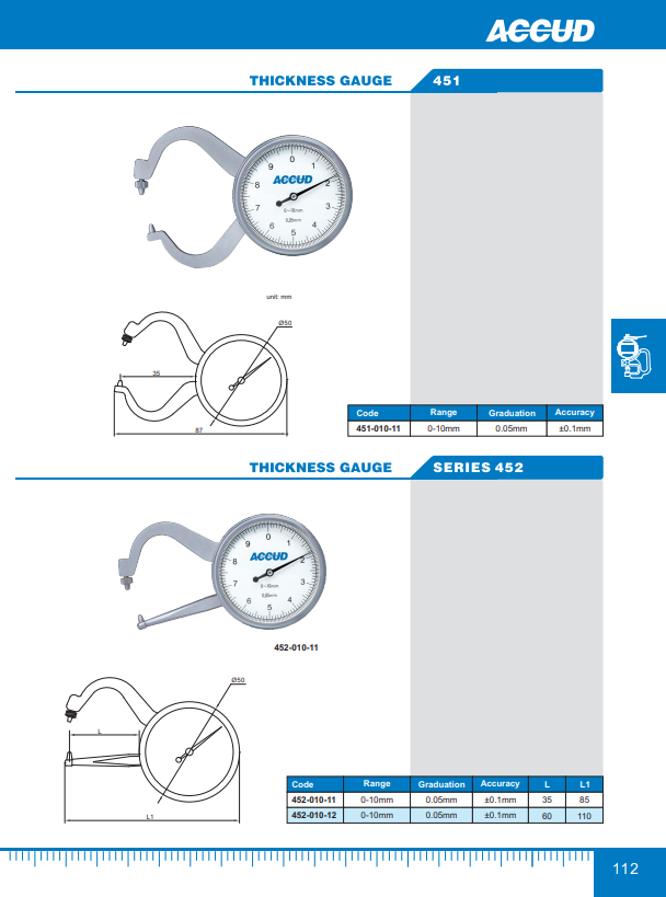 Medidor de espesores Serie 451, 0 a 10 mm, ACCUD